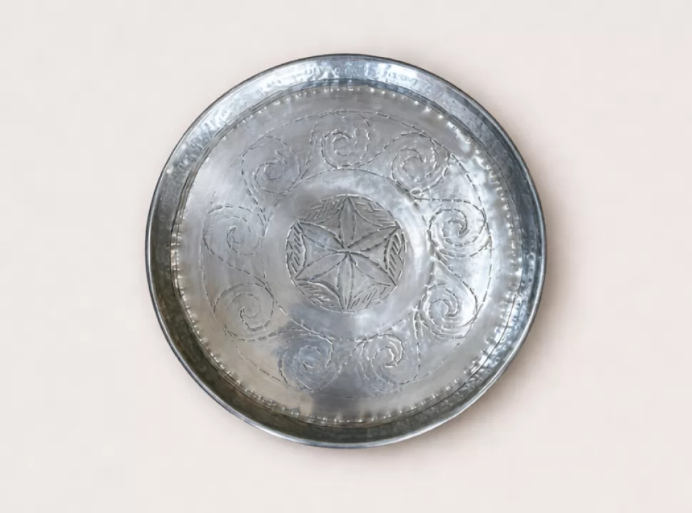Plato en metal labrado Diam. 38cm. Origen India Medida: 39x77x5/25 cm